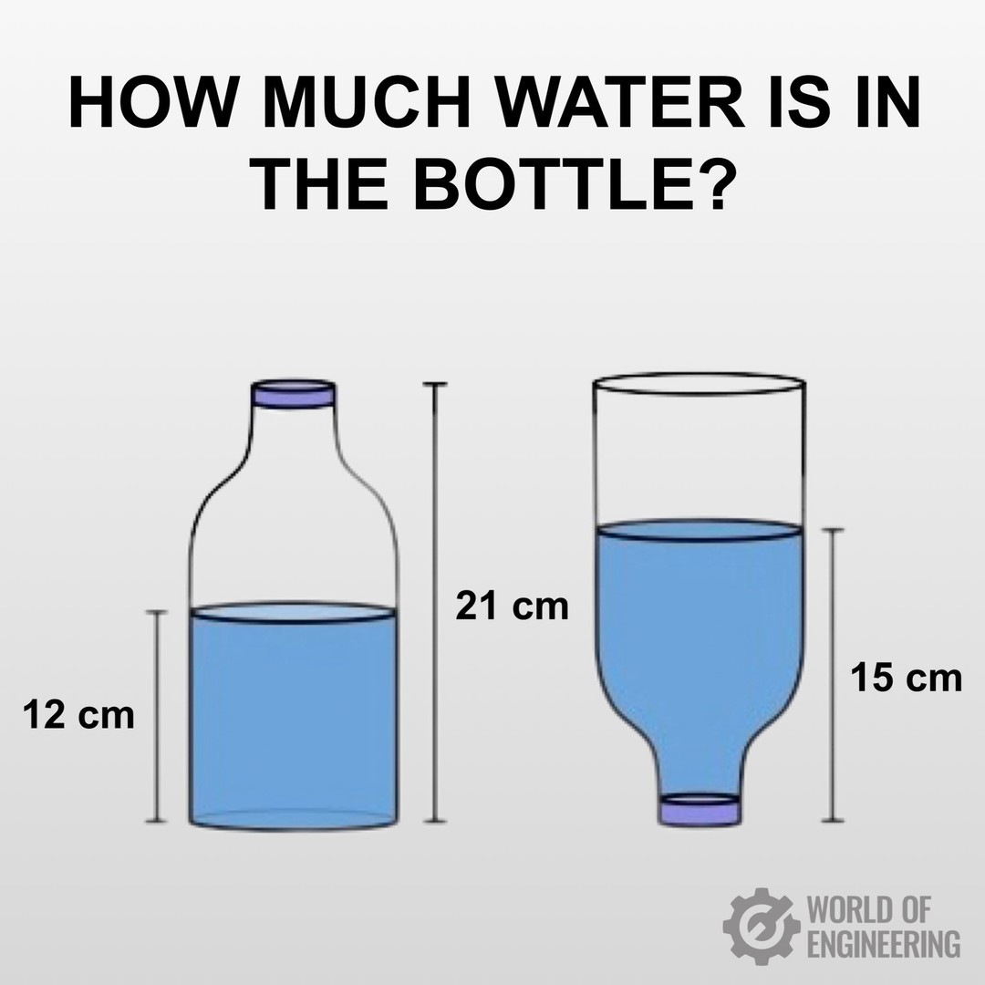 Câu trả lời ngắn: Lượng nước chiếm hai phần ba của chai vì phần rỗng bằng một nửa phần chứa nước (Ở hình bên phải: tổng chiều cao là 21 cm trừ 15 cm nước = 6 cm rỗng từ đáy, so với 12 cm nước ở bên trái).