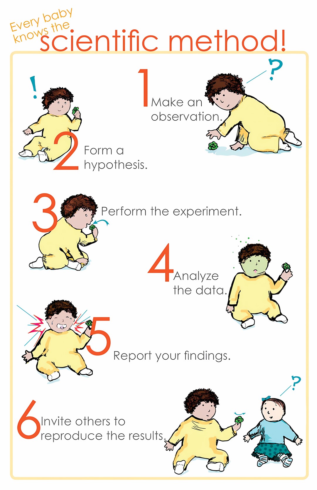 Ví dụ trong tấm hình dưới đây, các giả thuyết đã phát sinh trong đầu đứa trẻ khi vớ được một vật màu xanh chỉ có thể là: “cái này ăn được”, hoặc “cái này ngọt”, hoặc “cái này chắc là bông cải xanh broccoli” 😅