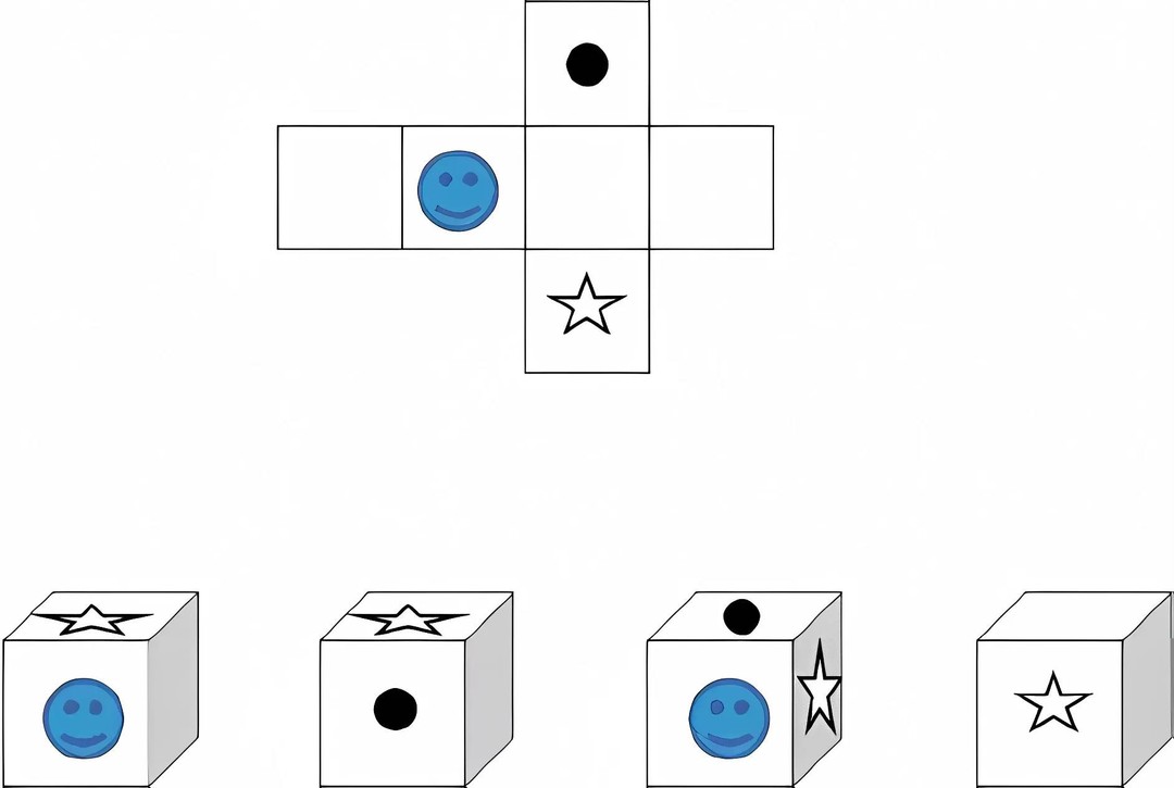 From rough intuition, we use heuristic “shortcuts” to quickly eliminate infeasible cases and pick a few most probable candidates to examine further rigorously (e.g., using formal/principled reasoning). This is called “problem-solving” skill. Specifically, in the case of this quiz:- Visual intuition allows us to recognize (1) the black dot is above & the star below the smiley face, with the black dot & star on opposite sides; and (2) the leftside, the bottom & the back of the boxes are invisible and might contain one of the 3 marks. Such commonsense knowledge, especially when un/partially observable as in (2), is still a huge challenge in all current AI systems, including ChatGPT. C.f. this $1.1M ARC Prize.